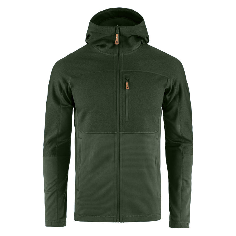 Expertly designed and versatile hooded sweater featuring a clever combination of two fleece fabrics to optimize warmth while minimizing weight and packing space. The hood, shoulders, and chest are crafted from flat-knitted polyester fleece (partially recycled) with a soft brushed inner layer, while the sides, lower torso, and lower sleeves utilize a lighter grid-structured fleece for superior ventilation. Ideal for use as a quick-drying and moisture-wicking mid layer during day trips or cool summer evenings. Includes a comfortable hood and one-way front zipper. Also features one chest pocket and two hand pockets, all equipped with secure zippers.